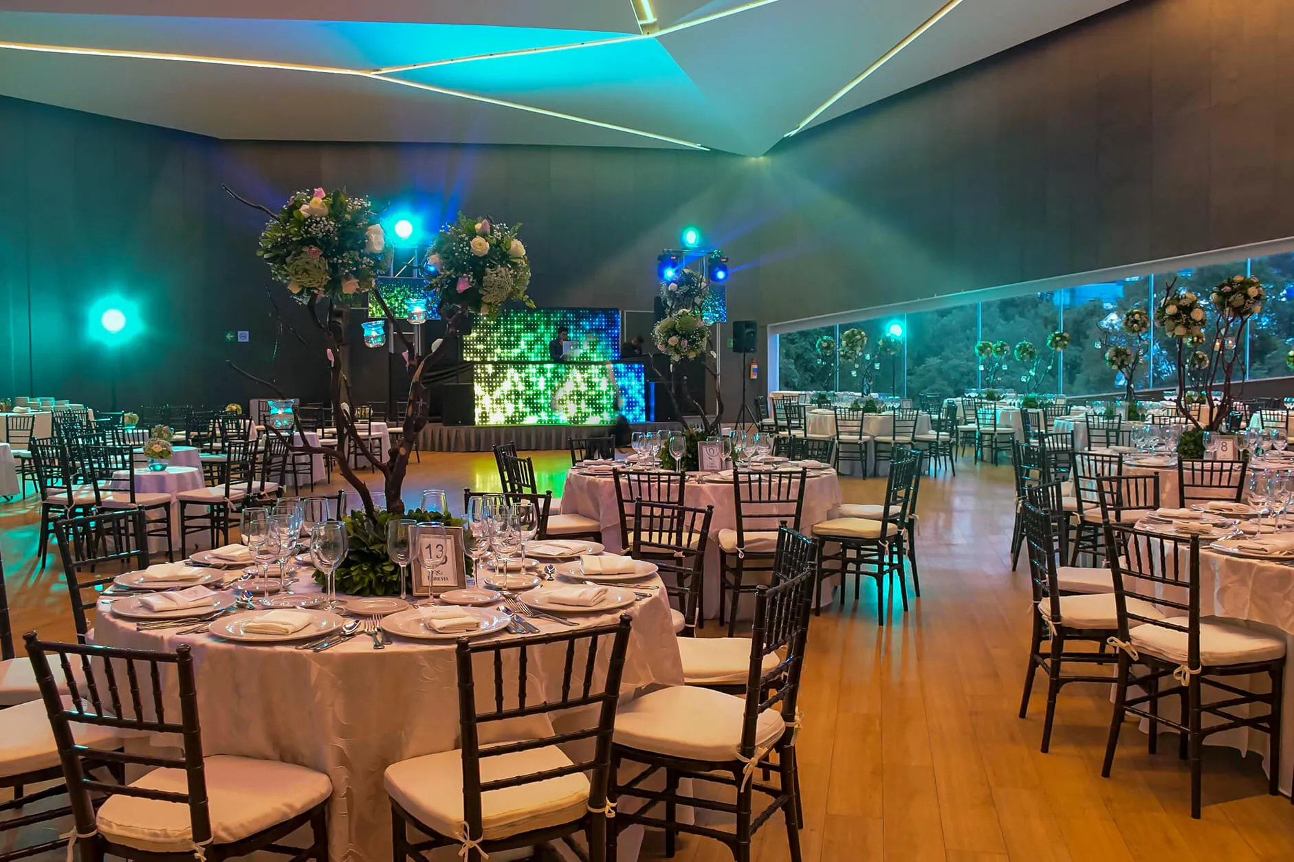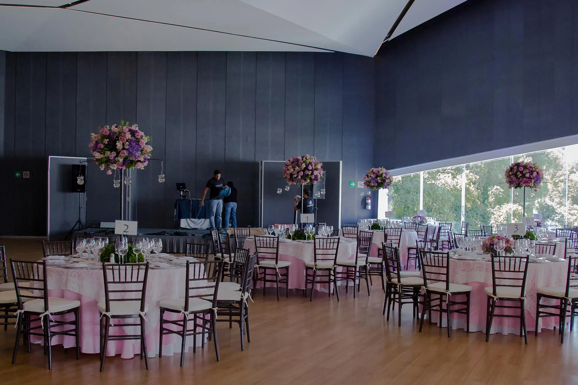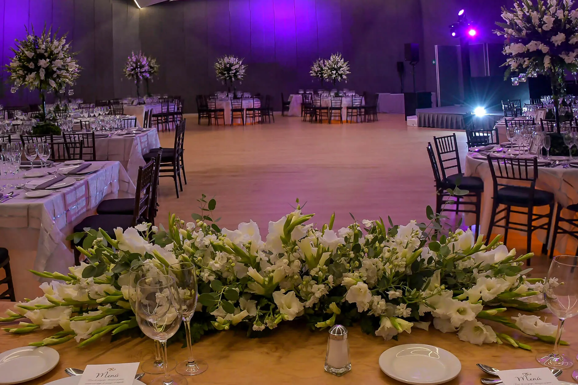 - Montaje de mesas cuadradas, redondas o mixtas con mantelería y caminos (a tu elección).